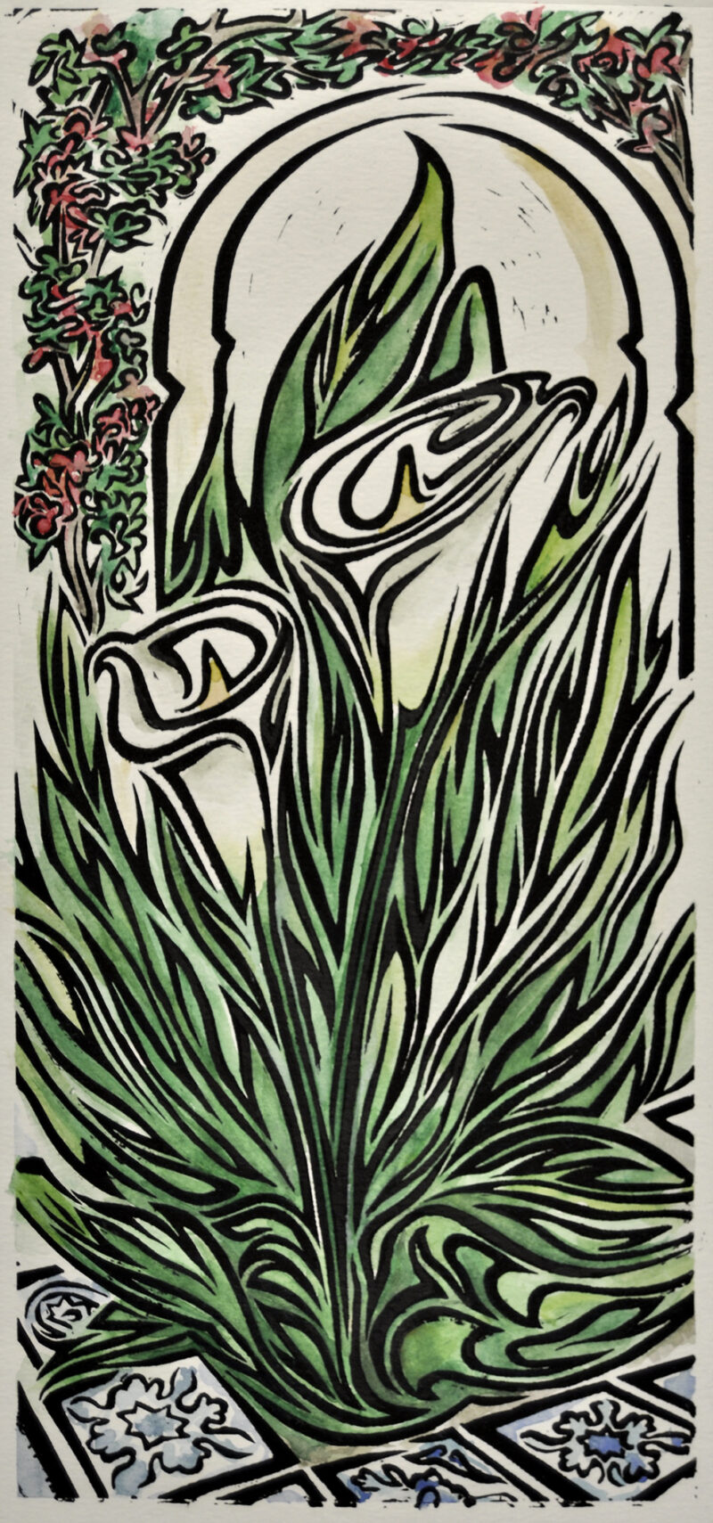 « Arums » linocut and watercolor on paper, monotype. 55×20 cm