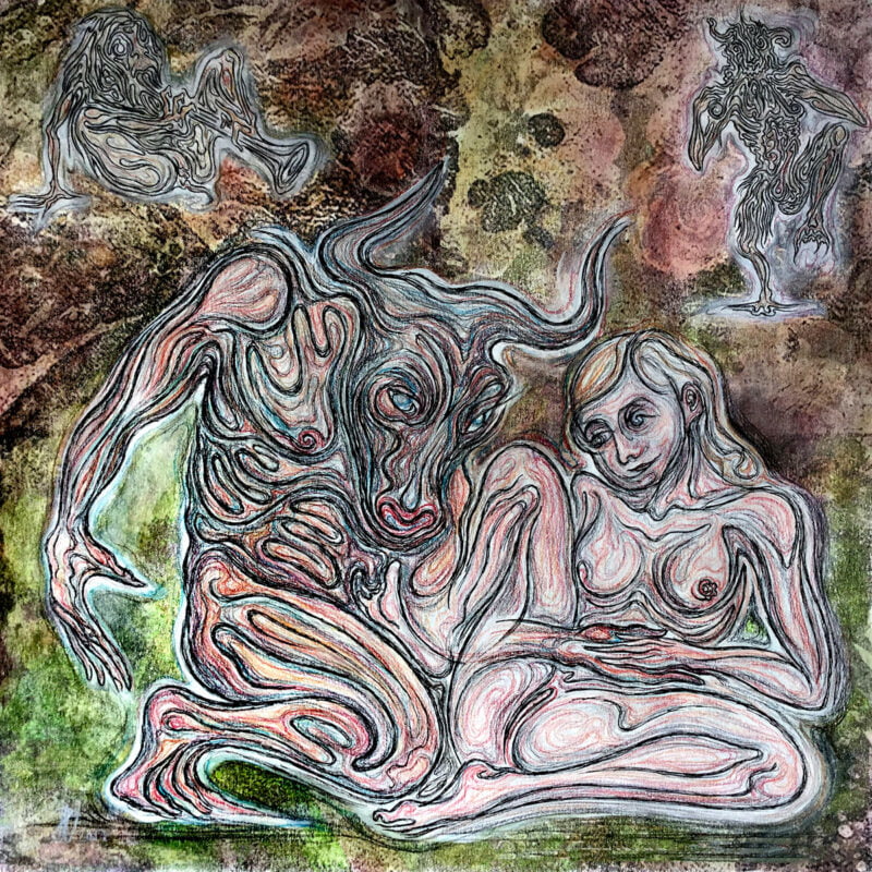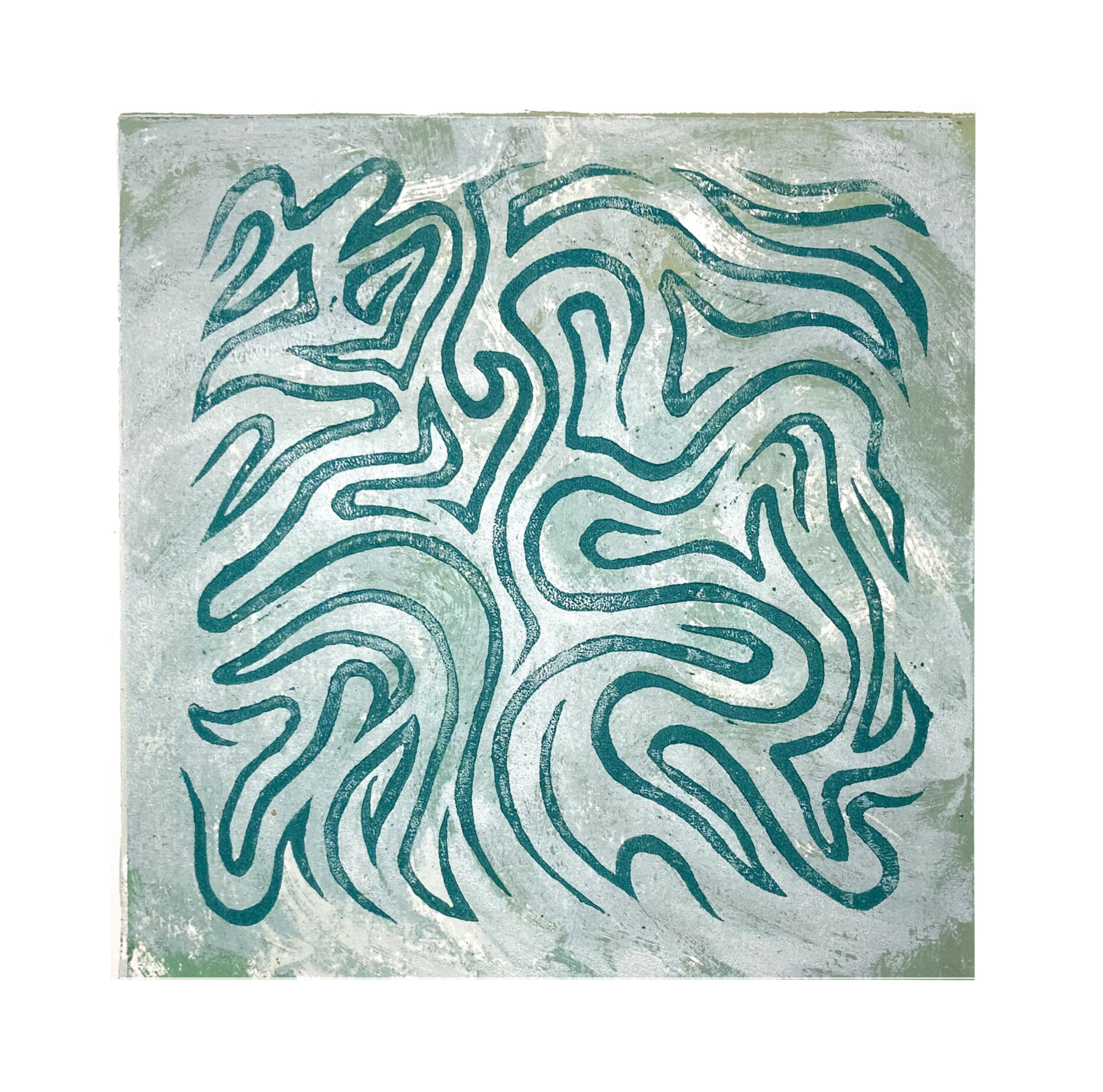 The technique aims to combine the strength of the engraved line (the linear blue-green motif) with the uniqueness and textural richness of the monotype.