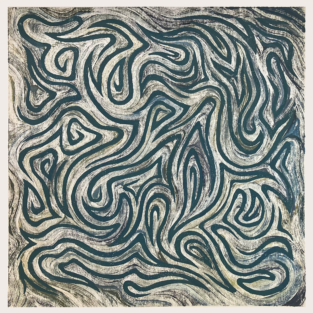 This work successfully achieves the feat of being both dense and airy. Despite the repetition of the motif, it doesn’t feel stifling; one follows the path traced by the gouge and the roller with an almost meditative curiosity. It’s a piece that demands time: the more one looks at it, the more the motifs seem to shift.