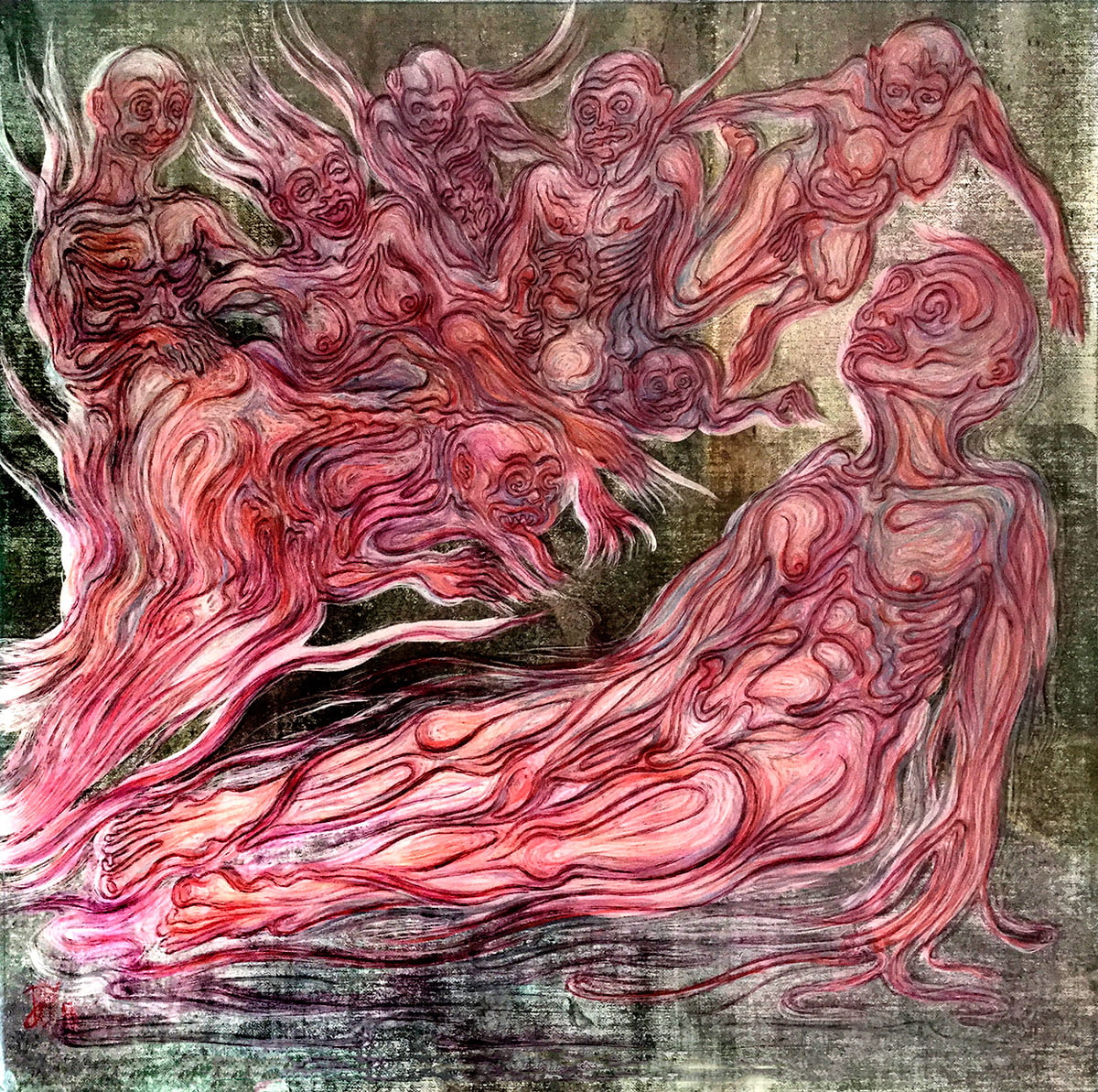 « The temptation of Saint Anthony » Mixed media on plexiglass in superimposed layers and paper, 60cm x 60cm